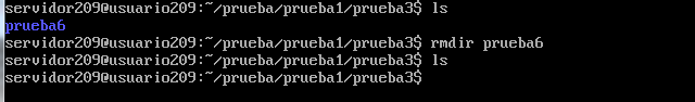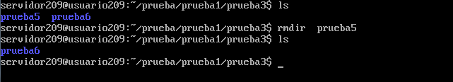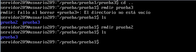 Intentamos borrar prueba3 pero como el directorio no está vacío nos mostrara error, así que ahora intentamos borrar prueba2 la cual si se puede porque el directorio esta vacío
