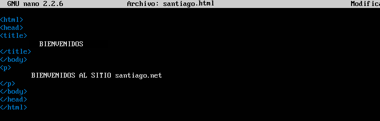 Creamos un archivo llamado “santiago.html” con el comando “touch” y luego editamos con el comando “nano”