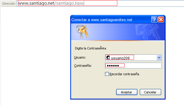 Ahora vamos al navegador y colocamos nuestra página y digitamos la contraseña del usuario y le damos aceptar y nos mostrara pagina www.santiago.net/santiago.html